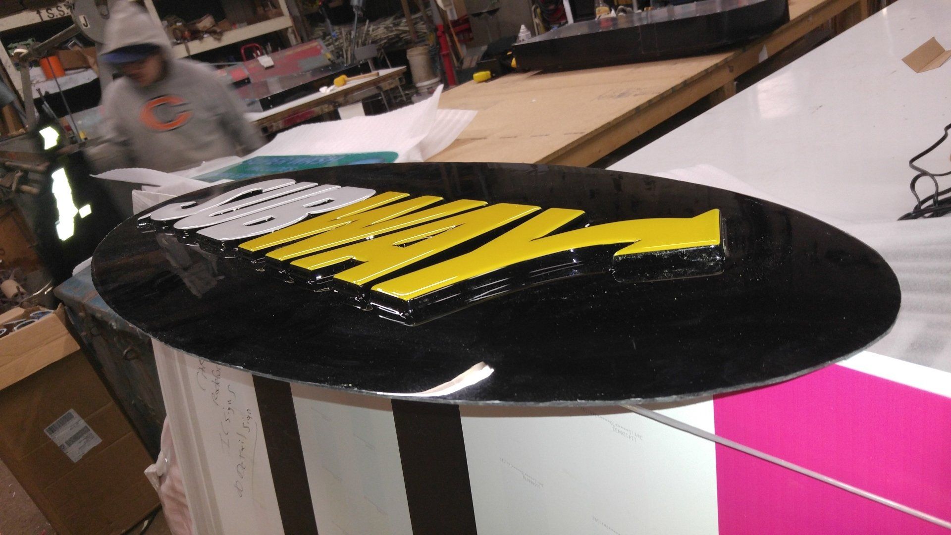 Push thru letters are made by routing a shape in a sheet of metal (the face) and then routing the same shape (only smaller) from another material, often clear acrylic. The face is placed inside a cabinet and interior illuminated. The effect is very dramatic and creates a very high tech or sophisticated look.